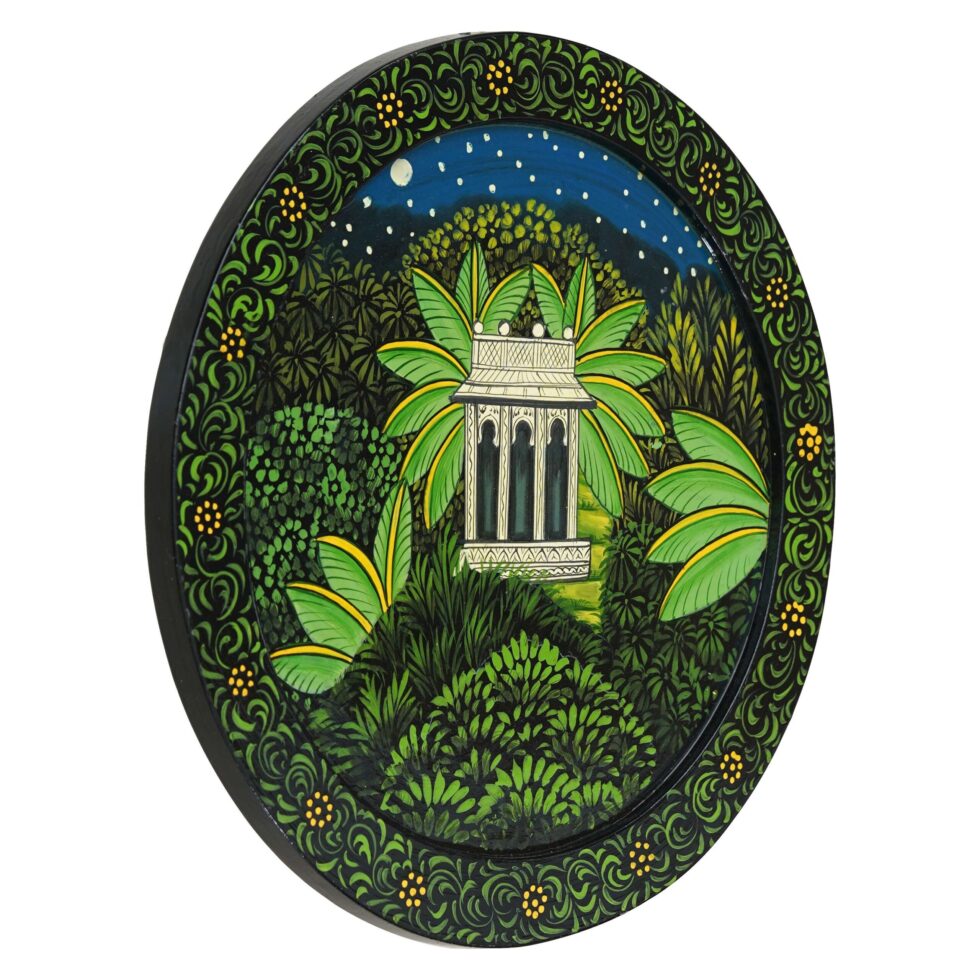 This hand-painted pichwai features a unique and captivating scene of a house nestled within a lush jungle. The intricate details and vibrant colors bring this artwork to life. Perfect for adding a touch of cultural intrigue to your home or as a gift for someone who appreciates unique and exotic art.